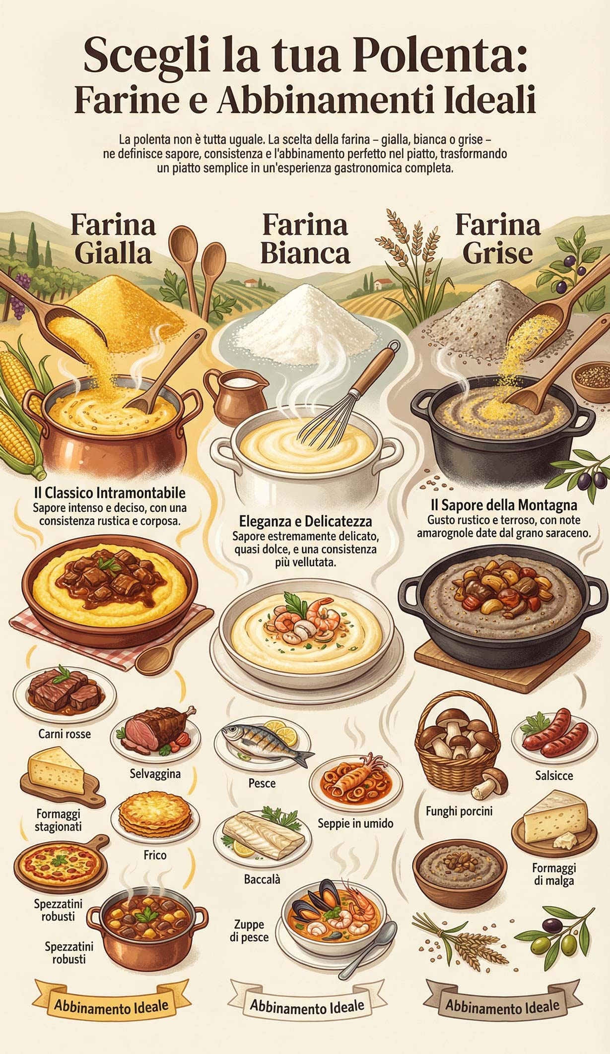 La qualità della polenta dipende quasi esclusivamente dalla qualità della farina utilizzata. Nel vasto panorama delle farine per polenta, tre tipologie principali si contendono il primato, ognuna con caratteristiche organolettiche, consistenze e utilizzi ben precisi. Parliamo della farina gialla, della farina bianca e della farina grise, tre sfumature di gusto che raccontano territori e tradizioni diverse.