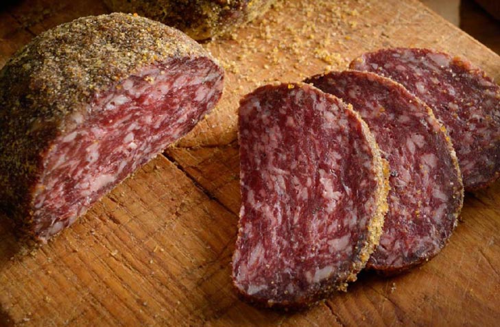 La carne, disossata e sminuzzata finemente, viene impastata con sale, aglio, pepe nero e una miscela di erbe aromatiche di montagna, tra cui il ginepro. L’impasto viene poi modellato a mano in polpette, passato nella farina di mais per creare una barriera protettiva e infine messo ad affumicare lentamente con legno di faggio.